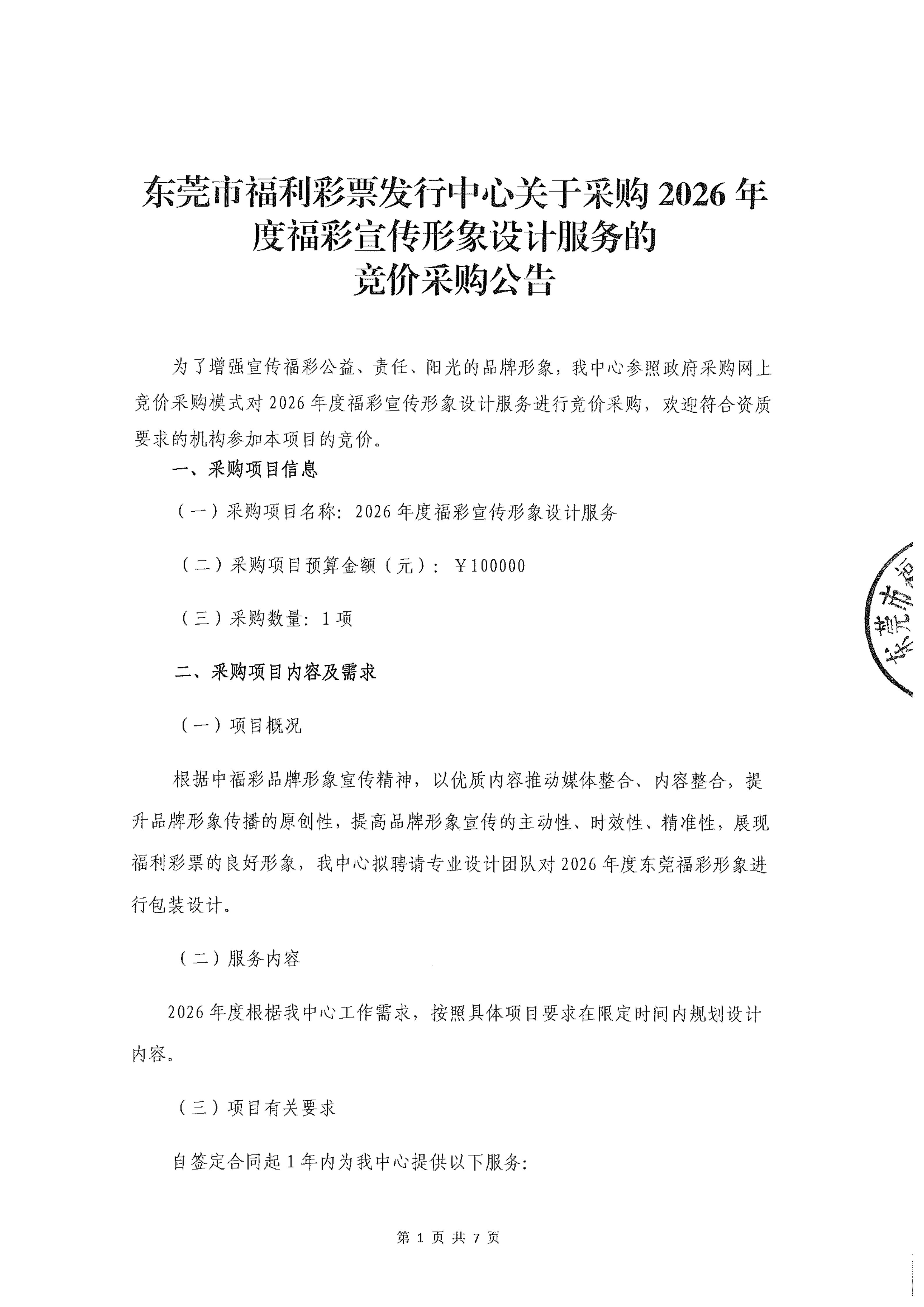 东莞市福利彩票发行中心关于采购2026年度福彩宣传形象设计服务的竞价采购公告