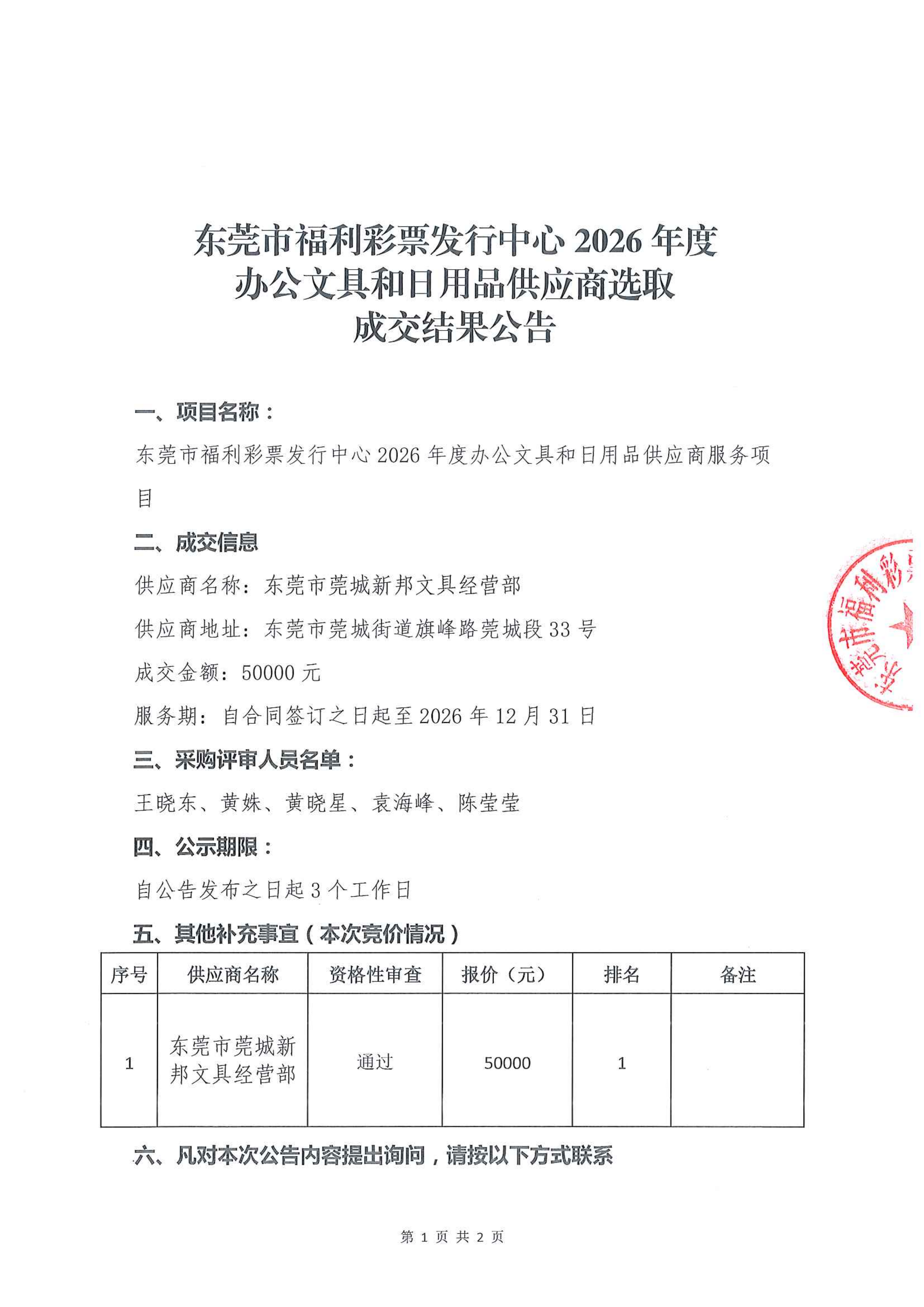 东莞市福利彩票发行中心2026年度办公文具和日用品供应商选取成交结果公告