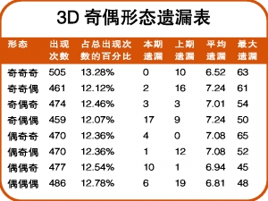 3D奇偶方面共8个形态中,“奇偶偶”是近期最冷的形态,到前天晚上第12221期开奖结束,已经遗漏了长达17期,是平均遗漏周期7.24期的2倍多。除了“奇偶偶”之外,其次偏冷的当属“偶偶奇”,到前天晚上开奖后为止,已经遗漏了10期,是其平均遗漏周期6.94期的近2倍,近几期出现的几率非常大。