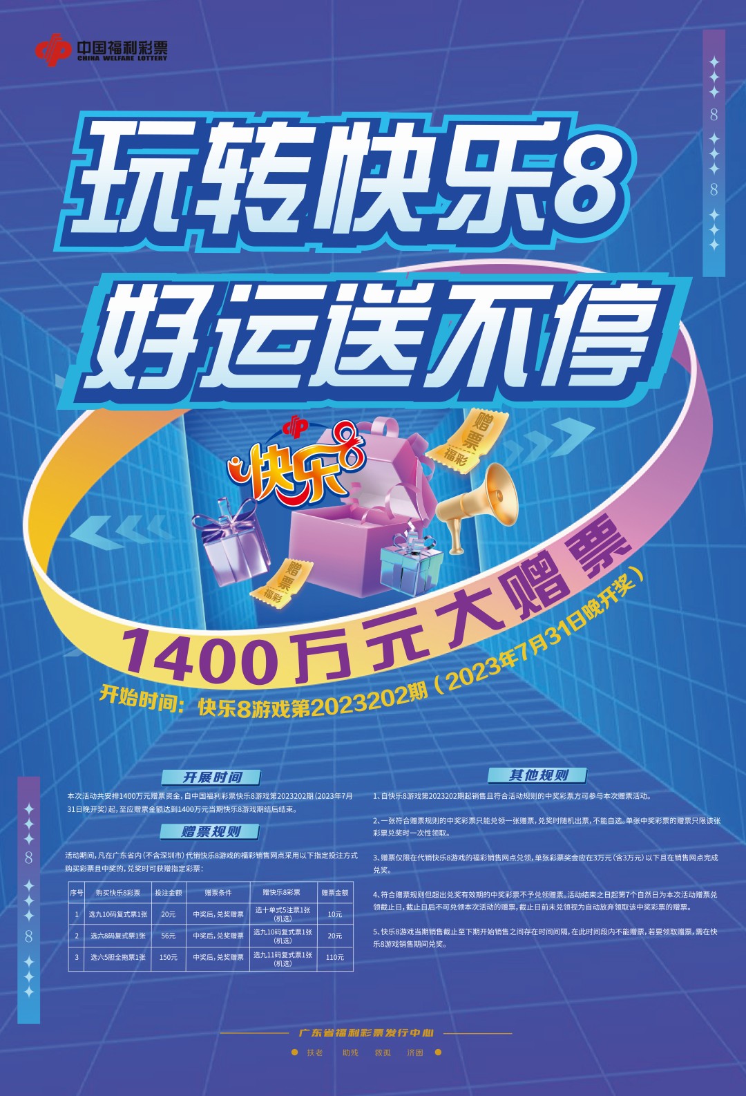 今年5月,广东省福利彩票发行中心在省内(不含深圳市)开展“玩转快乐8,好运欢乐送”中国福利彩票快乐8游戏1000万元赠票营销活动,受到广大彩民的喜爱和支持。为进一步回馈彩民,广东福彩将自中国福利彩票快乐8游戏第2023202期(2023年7月31日晚开奖)起,在全省范围内(不含深圳市)再度开展快乐8游戏赠票活动——“玩转快乐8,好运送不停”,本次活动共安排1400万元赠票资金,自至应赠票金额达到1400万元当期快乐8游戏期结后结束。