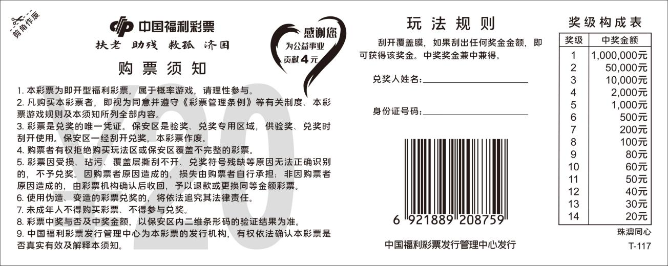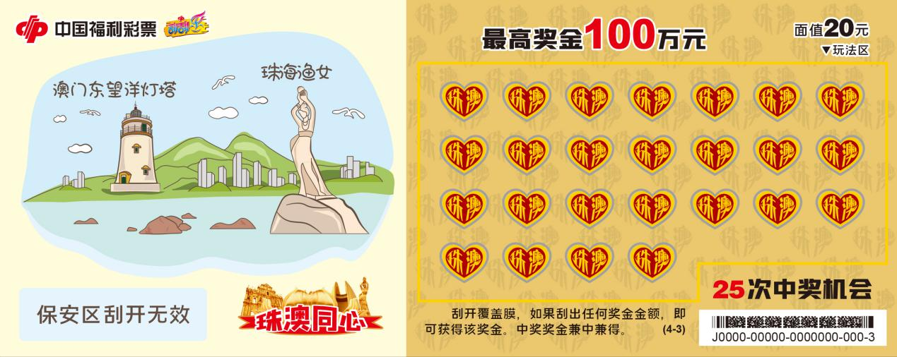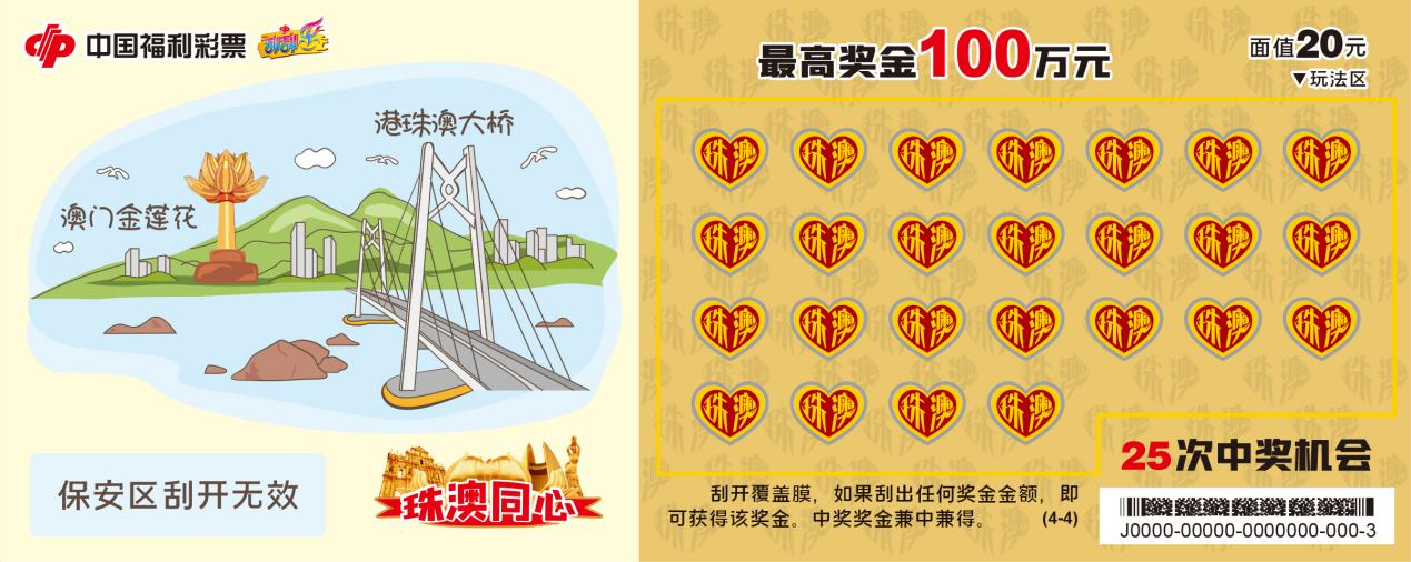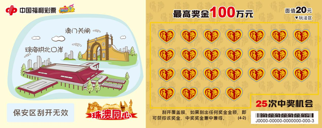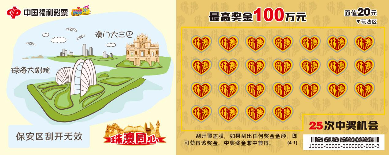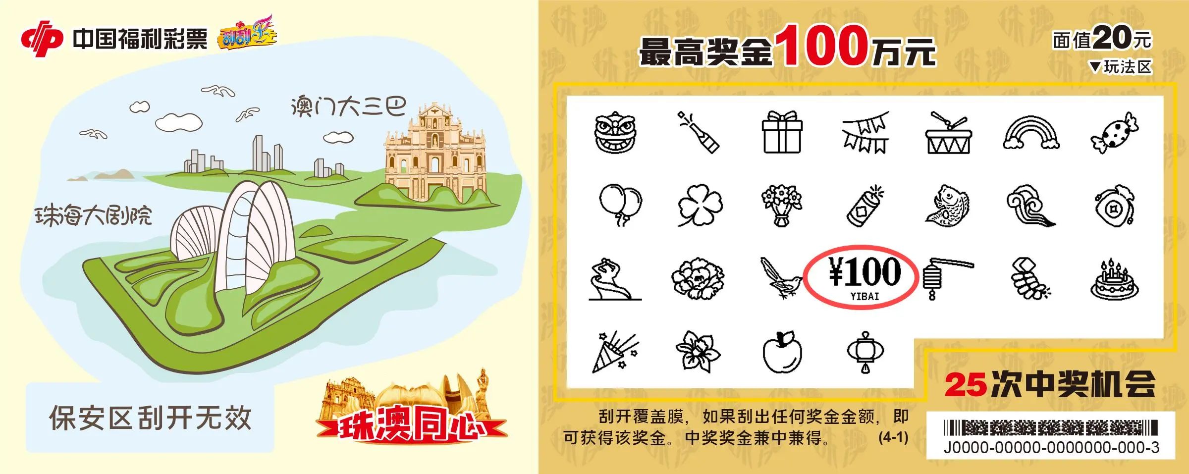 “珠澳同心”刮刮乐即开票面值为20元,共25次中奖机会,最高奖金100万元。