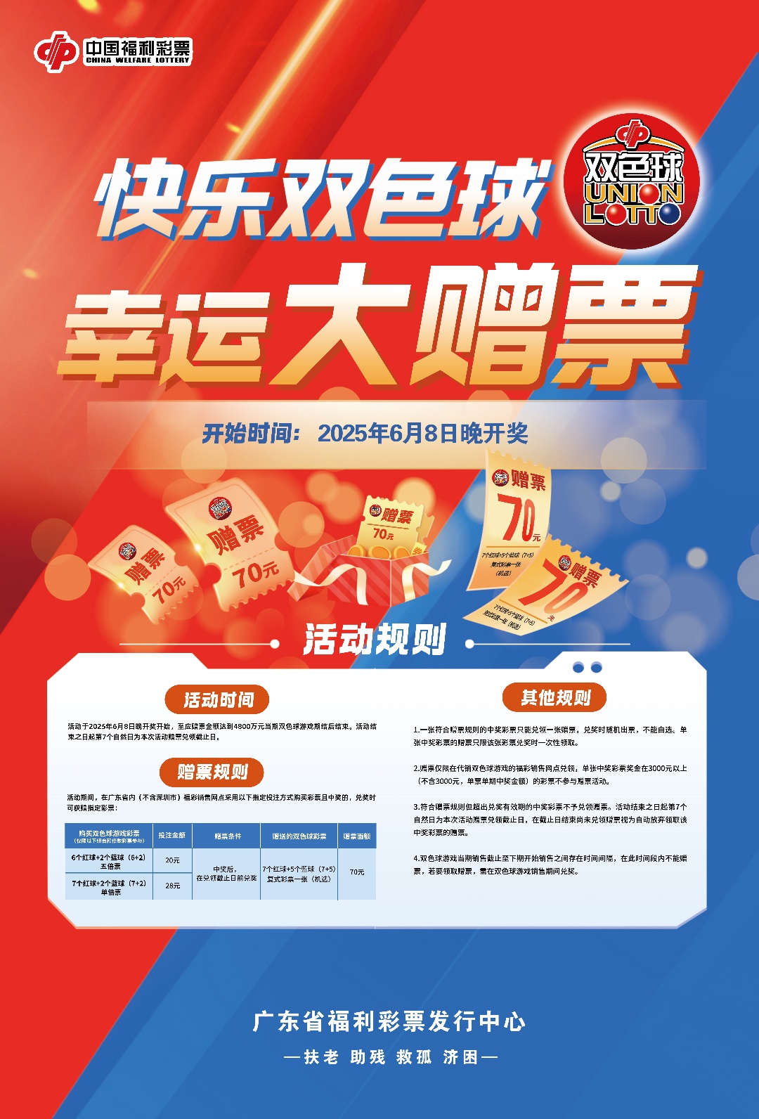 为回馈广大购彩者,广东省福利彩票发行中心决定自2025年6月8日起,在全省范围内(不含深圳市)开展“快乐双色球 幸运大赠票”4800万元营销活动。活动期间,采用指定的2种玩法方式投注且中奖的,可获赠面额价值70元的双色球游戏“7个红球+5个蓝球(7+5)”复式彩票一张。