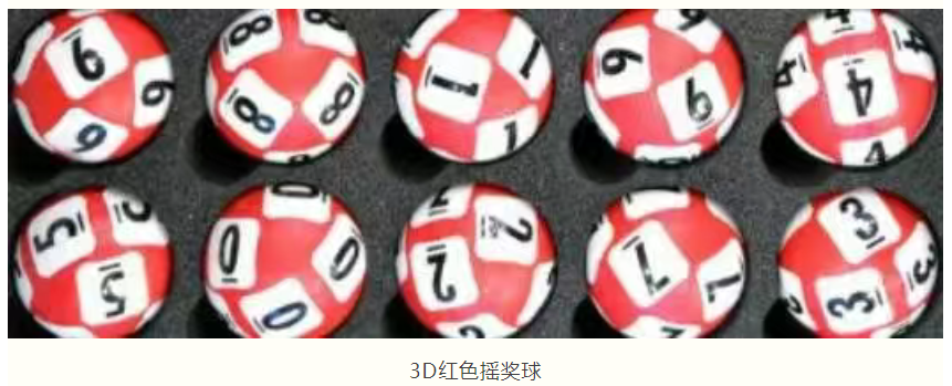 同样的,3D摇奖球分为三种颜色,其中之一也是红色,每套摇奖球包含10个红色球,开奖时摇出一位中奖号码。