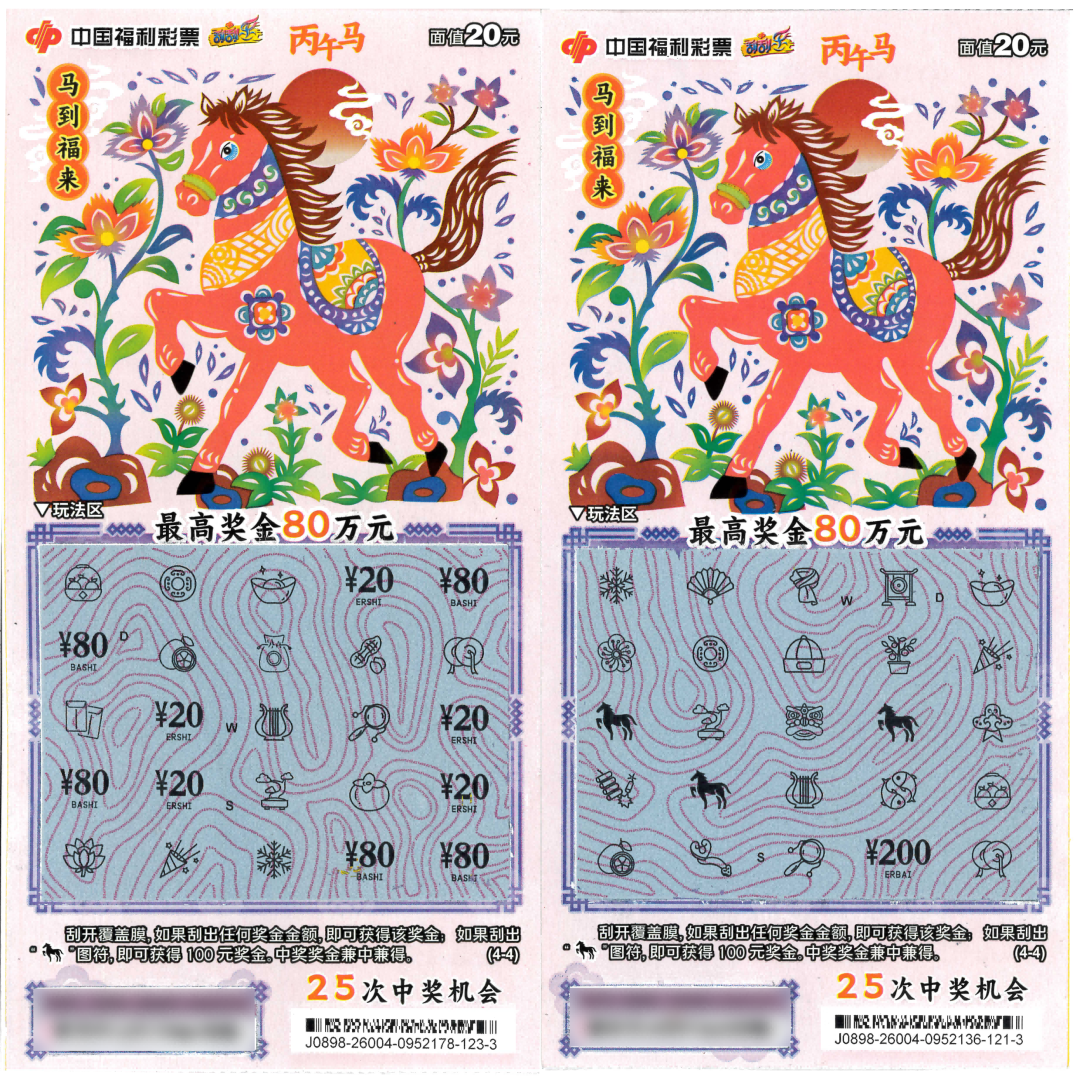 活动期间,对中国福利彩票“丙午马”生肖主题即开票单张彩票中得500元奖级的中奖者,除兑付中奖奖金外,额外赠送1本(整本)价值500元的“丙午马”生肖主题即开票(5元面值、10元面值、20元面值均可,一本价值500元)。