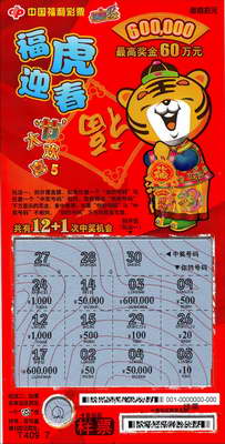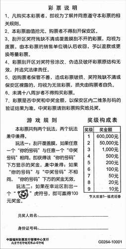 玩法二:如果在幸运区刮出一个“ ”虎符号,即可赢得100元奖金。奖金及数量详见本须知内的《彩票奖级构成表》。
