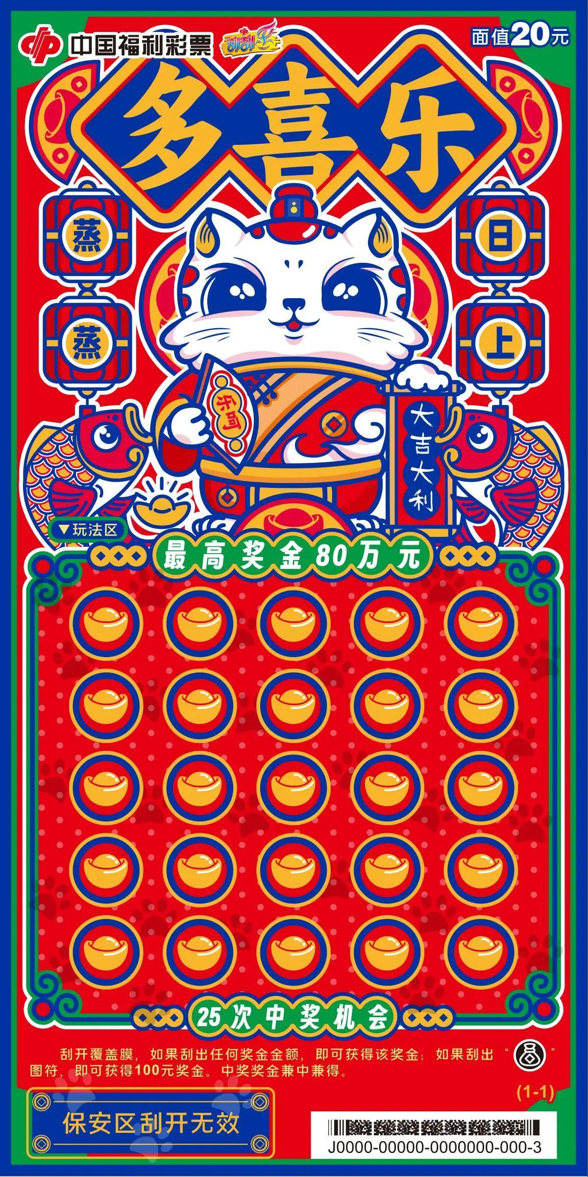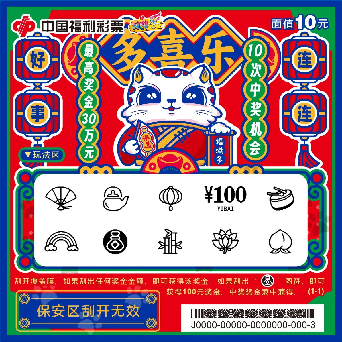 近日 寓意欢乐祥和 福运满盈 生活美满的刮刮乐新票 “多喜乐”隆重登场 票面介绍 刮刮乐新票“多喜乐”采用国潮风设计,以红色为主色调,搭配蓝色和黄色,色彩鲜艳,充满喜庆氛围。本次上市的新票有10元、20元两种面值。 多喜乐10元 (最高奖金:30万元) ![]() 多喜乐10元票面展示