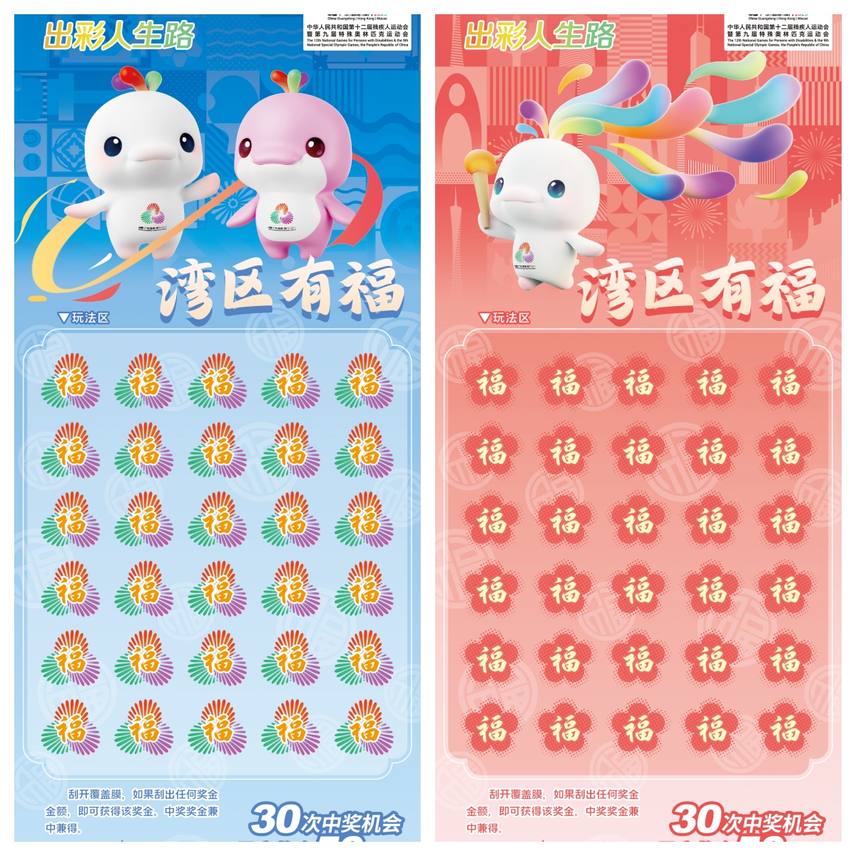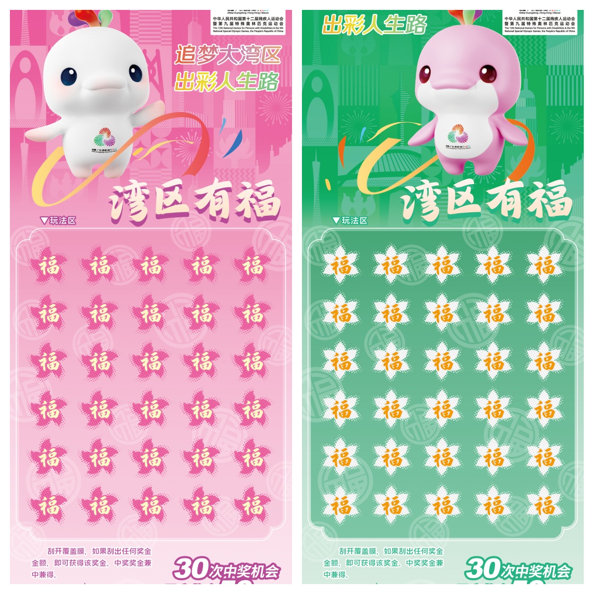 据了解,“湾区有福”即开型福利彩票面值30元,设12个奖级,最高奖金50万元,共包含4款画面。“湾区有福”彩票票面以十五运会和残特奥会的吉祥物“喜洋洋”“乐融融”为核心视觉元素,融入残特奥会赛事会徽、“追梦大湾区