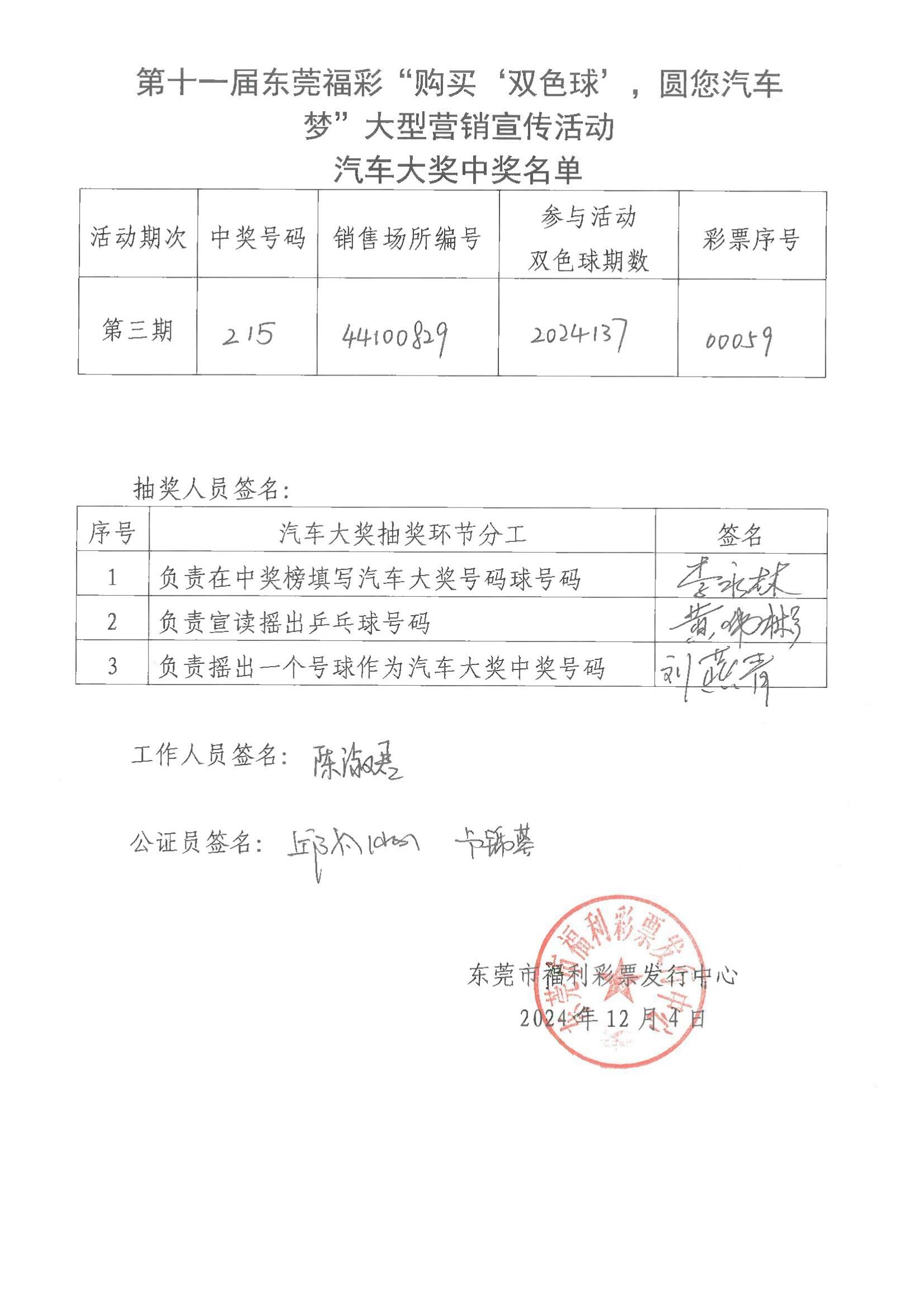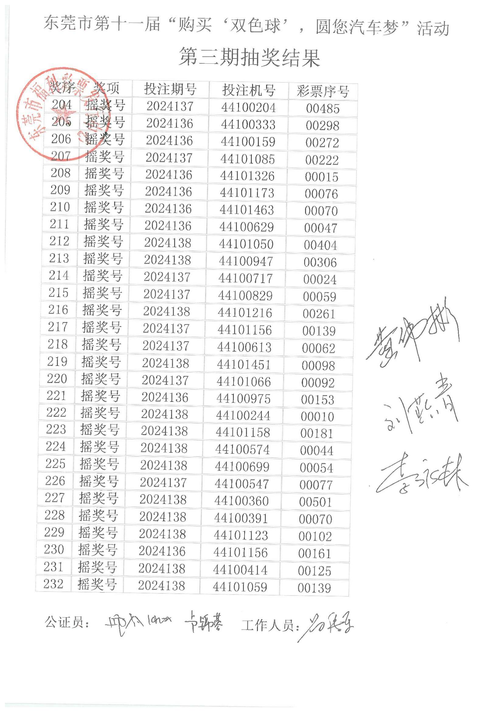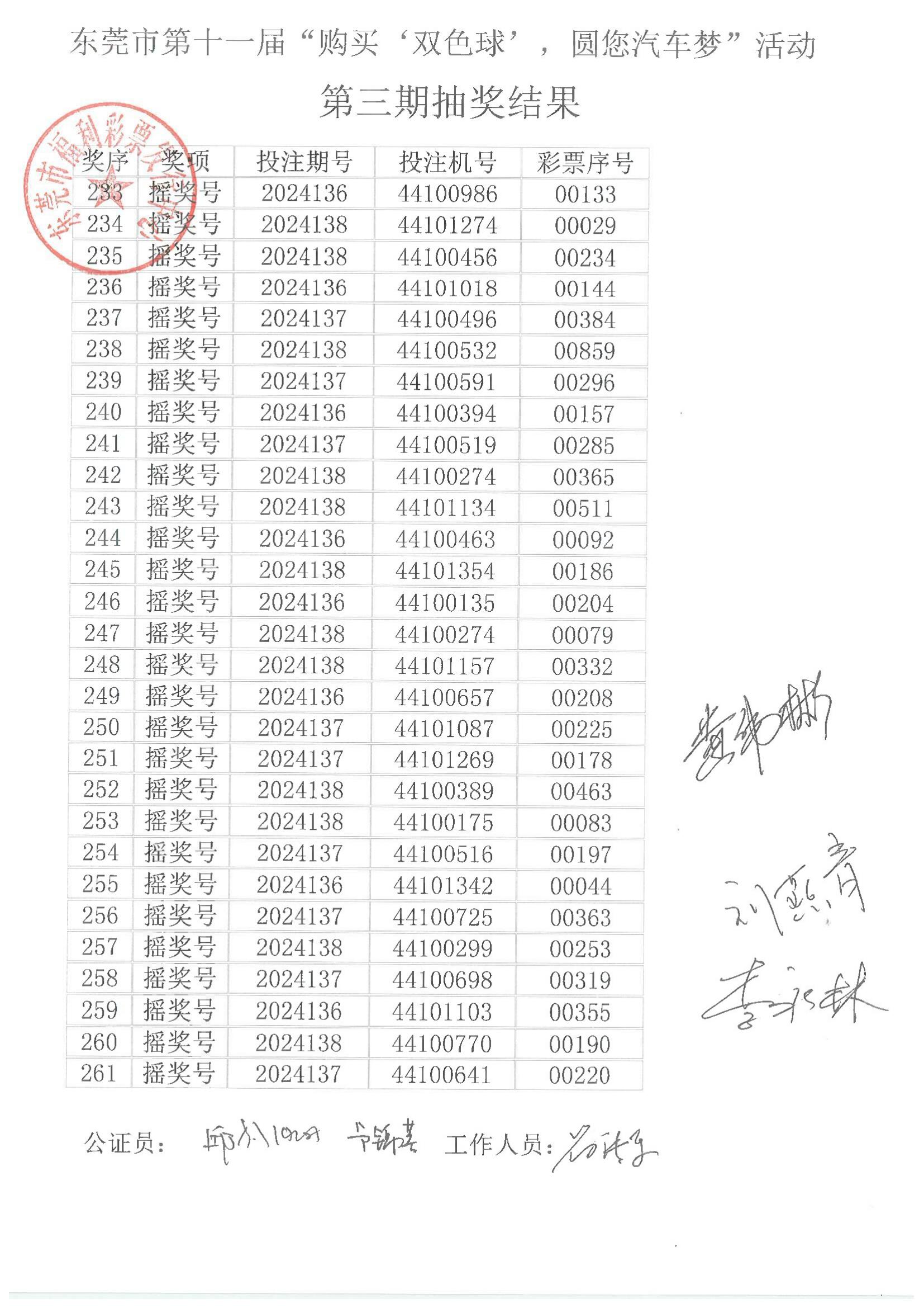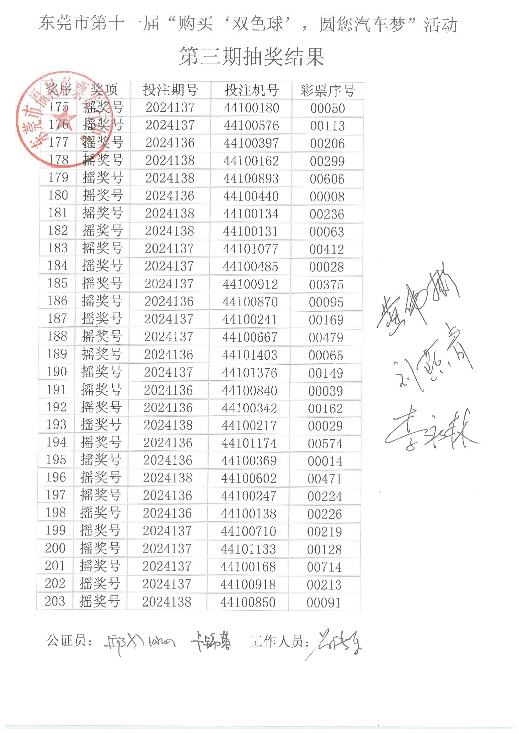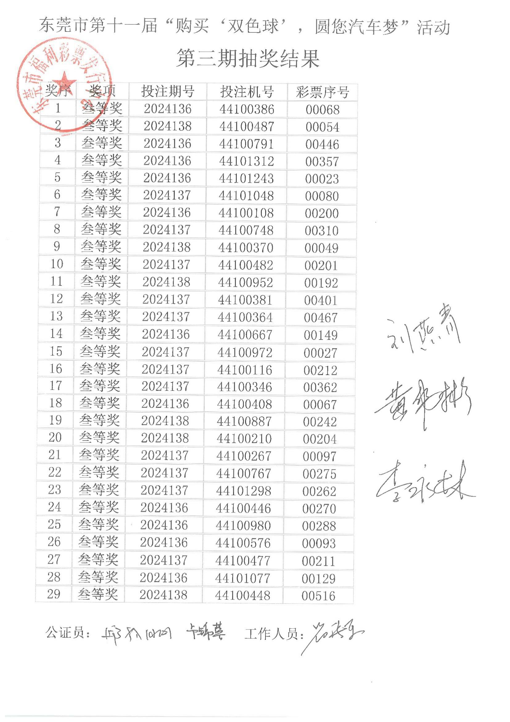 东莞市第十一届“购买‘双色球’,圆您汽车梦”活动第三期抽奖结果