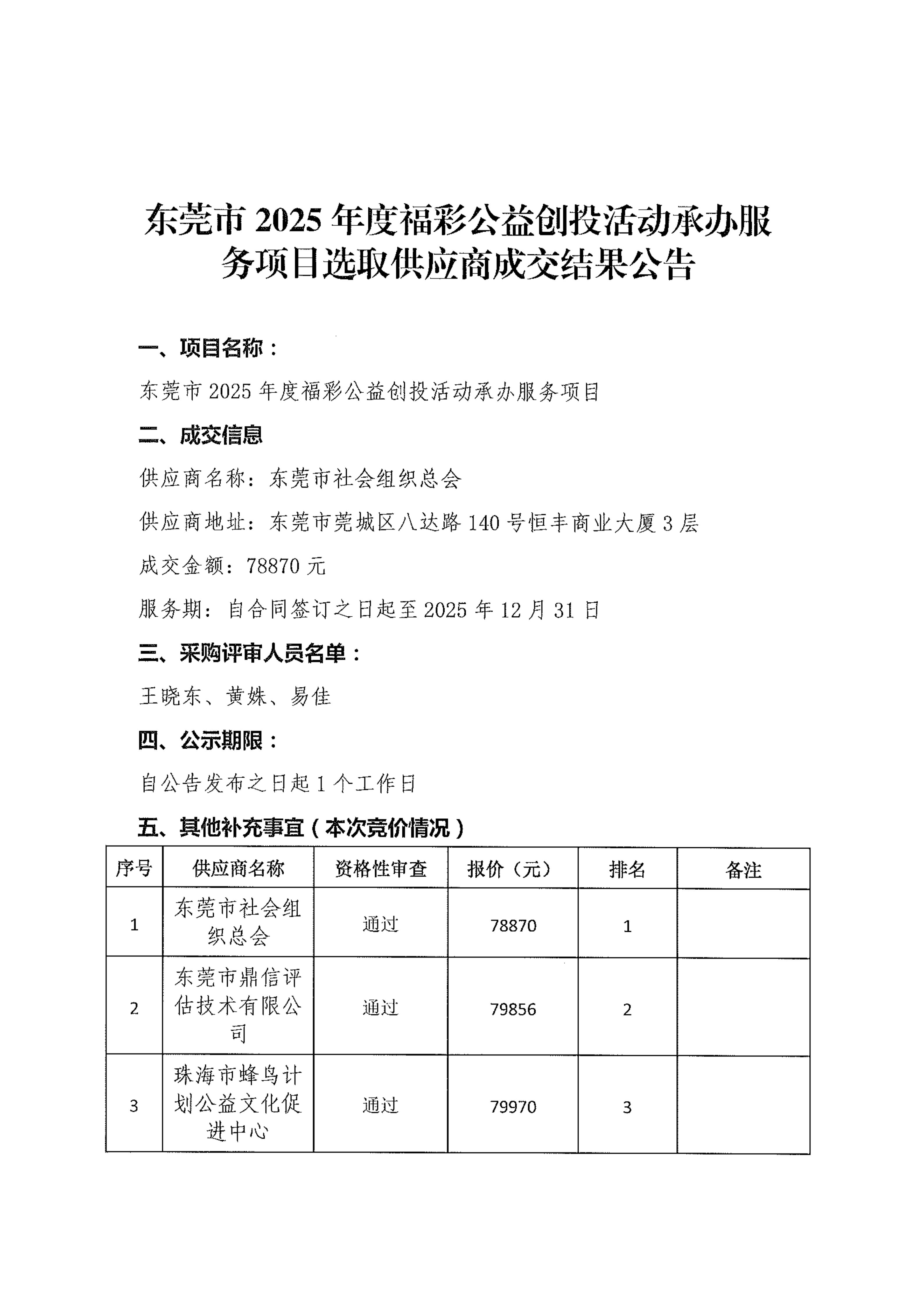 东莞市2025年度福彩公益创投活动承办服务项目选取供应商成交结果公告