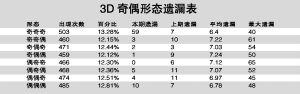 3D奇偶方面共8个形态中,“全奇”是近期最冷的形态,到前天晚上第12205期开奖结束,已经遗漏了长达59期,是平均遗漏周期6.40期的9倍。除了“全奇”之外,其次偏冷的当属“全偶”,到前天晚上开奖后为止,已经遗漏了10期,是其平均遗漏周期6.78期的近2倍,近几期出现的几率非常大。