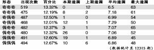 3D奇偶方面一共8个形态,“偶奇偶”是近期最冷的形态,到前天晚上第12315期开出“371”后,已经遗漏了长达26期,是平均遗漏周期7.06期的4倍。除了“偶奇偶”之外,其次偏冷的当属“偶偶奇”,到前天晚上开奖后为止,已经遗漏了19期,是其平均遗漏周期6.89期的3倍,近几期出现的几率非常大。